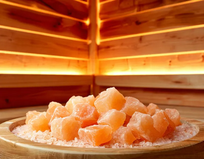 Отделка сауны плиткой из гималайской соли превратит помещение в соляную комнату. При нагревании вещество оказывает успокаивающее действие на человека, увеличивает концентрацию ионов в воздухе. Высокая температура, привычная для парилки, помогает выделению целительного пара и делает его благоприятным, схожим с горной атмосферой. Полезные компоненты гималайской соли при помощи высокой температуры попадают в открытые поры, выводя вредные вещества из организма.
